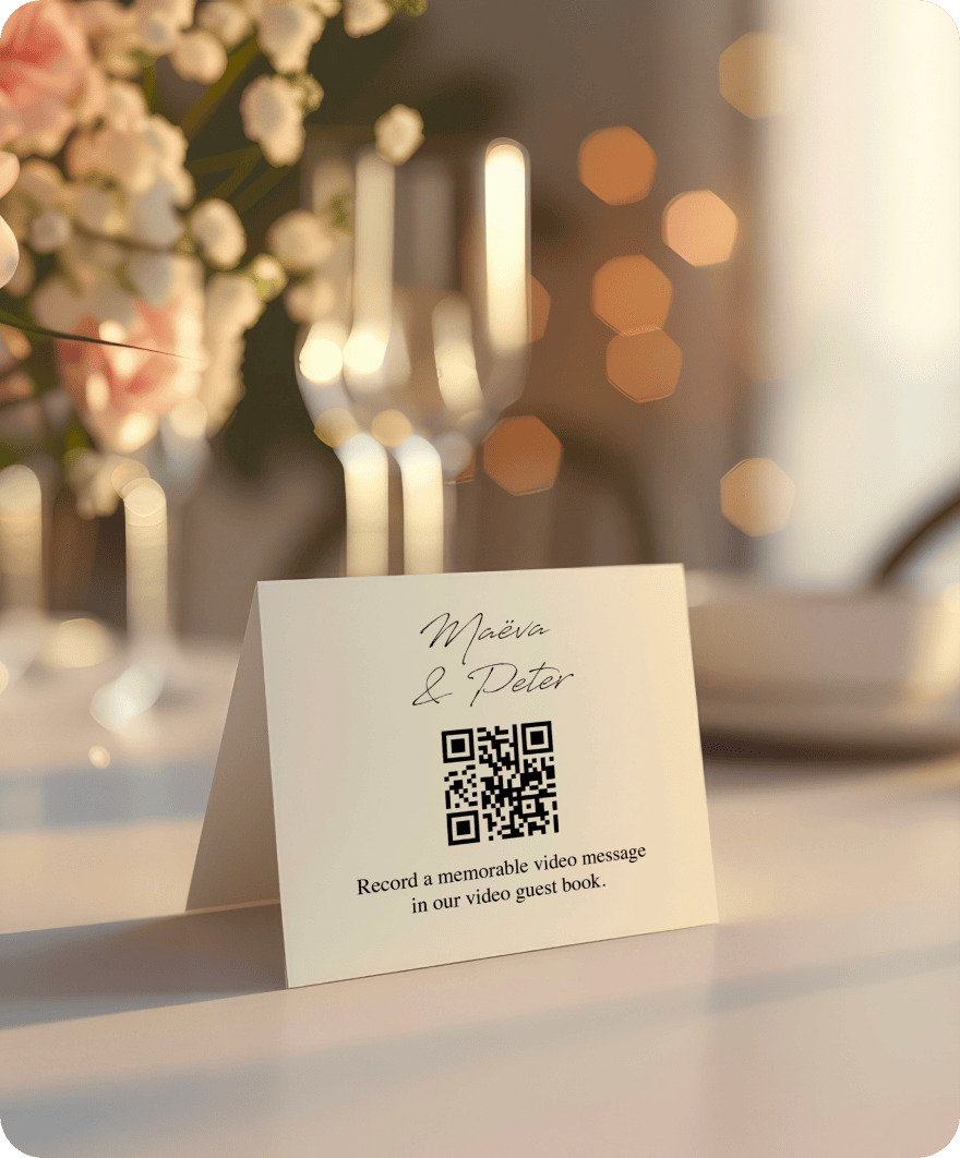You will have access to a private gallery that will gather all the videos recorded by your guests. You will be able, if you so want, to share this gallery with your close ones. Also, we will give you your “married” QR Code containing the address of your gallery so that you may engrave it, if you will, on an object of your choosing.