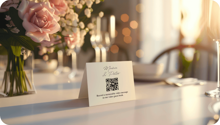We will provide you with a 'guests' QR Code to print on a name tag, menu, or poster, ensuring it is easily accessible and scannable by your guests. You can also send it on a postcard or by email before the wedding.