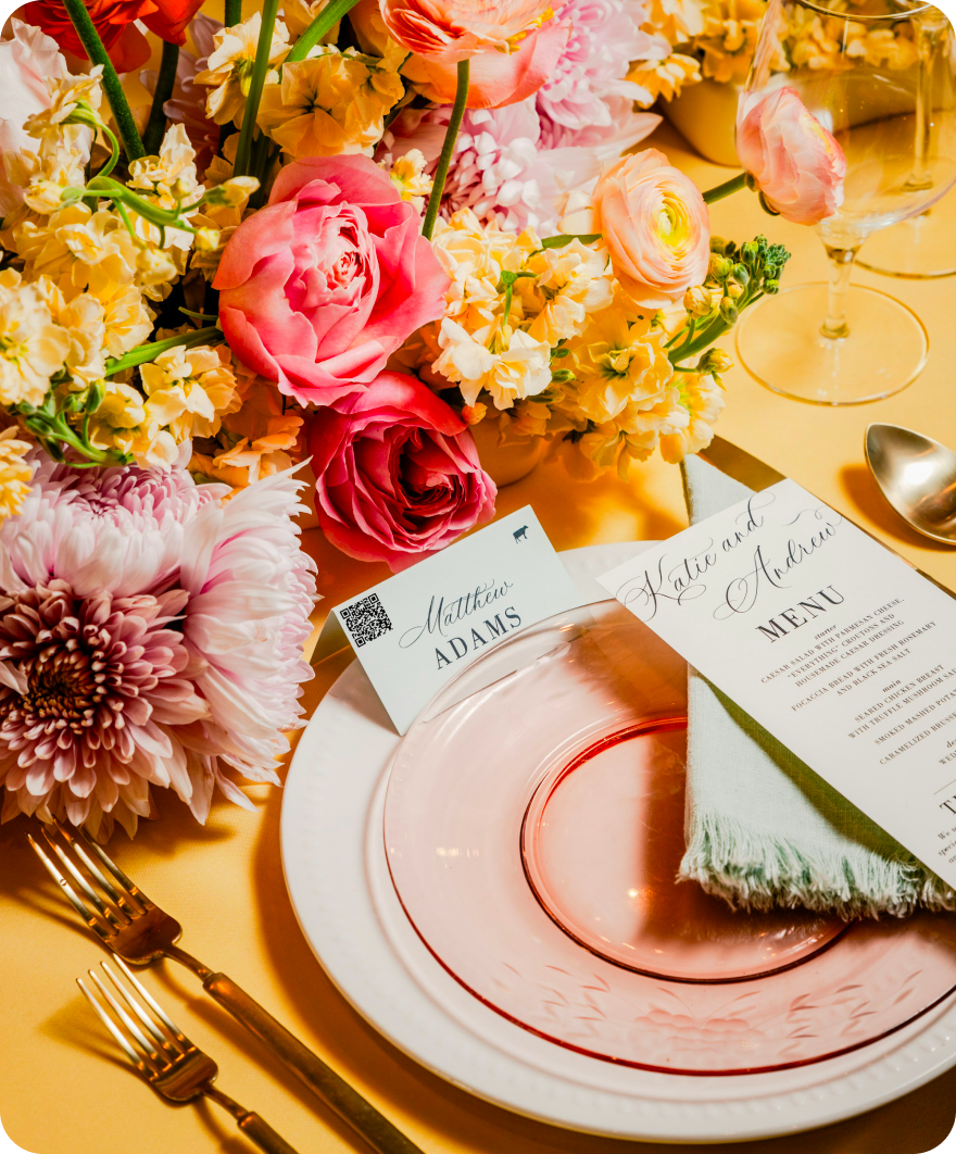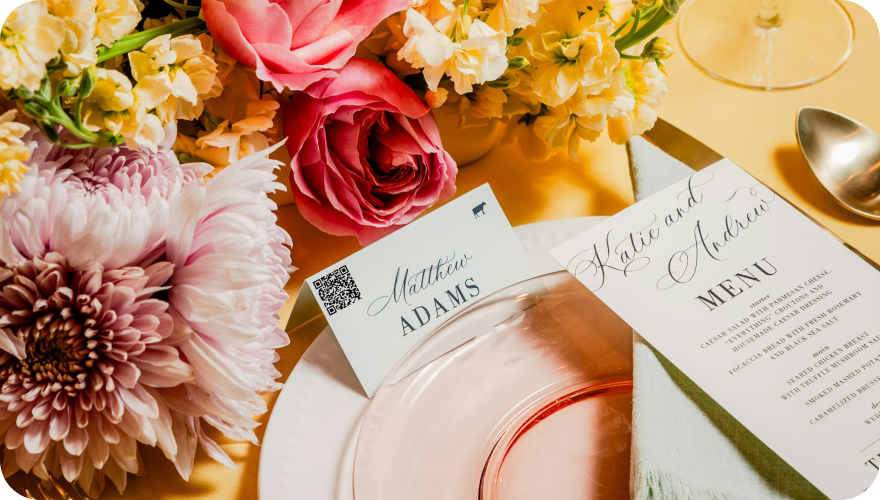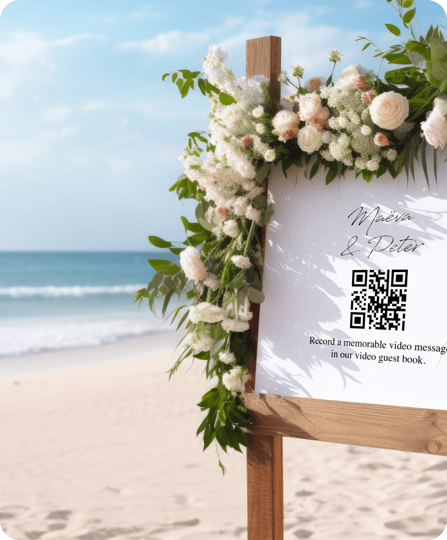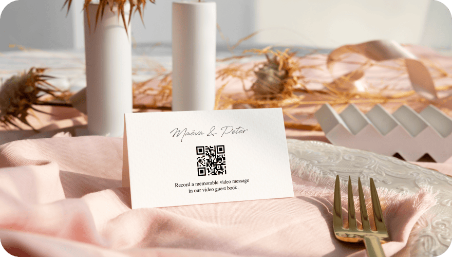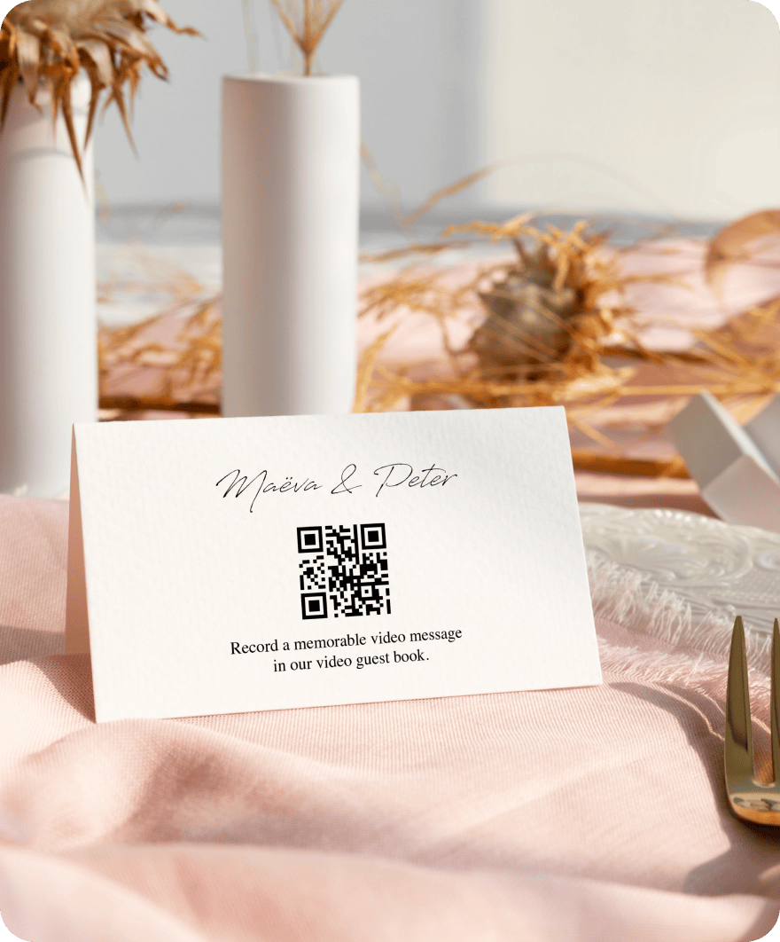 We will provide you with a 'guests' QR Code to print on a name tag, menu, or poster, ensuring it is easily accessible and scannable by your guests. You can also send it on a postcard or by email before the wedding.